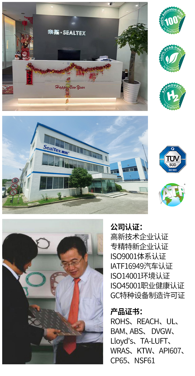 SealTex上海一柯索拓密封材料有限公司長期致力于各行業用100%無石棉環保密封墊片和耐高溫隔熱產品的生產及銷售,作為高新技術企業和專精特新認證單位,參與國家多項與密封墊相關的標準制定,可協助客戶進行密封失效分析如面壓測試和有限元分析,密封墊的設計與選擇。公司通過ISO9001、IATF16949、ISO14001 、ISO45001體系認證并取得GC特種設備制造許可證。工廠坐落于上海松江工業園區,擁有各種加工設備,實現從原材料復合到精密模切的垂直生產體系。