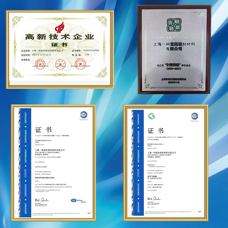 上海一柯索拓密封材料有限公司,作為高新技術(shù)企業(yè)和專精特新認(rèn)證單位,長期致力于各行業(yè)用100%無石棉環(huán)保密封墊片和耐高溫隔熱產(chǎn)品的生產(chǎn)與銷售。公司通過ISO9001、IATF16949、ISO14001、ISO45001體系認(rèn)證,并取得GC特種設(shè)備制造許可證。可協(xié)助客戶進(jìn)行密封失效分析,如FUJI測(cè)試和有限元分析,密封墊的設(shè)計(jì)與選擇。